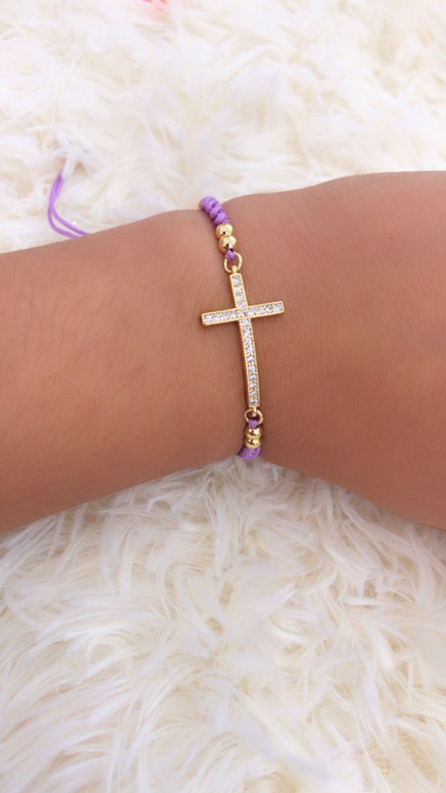 Pulsera de cordón morado con dije de cruz. ajustable