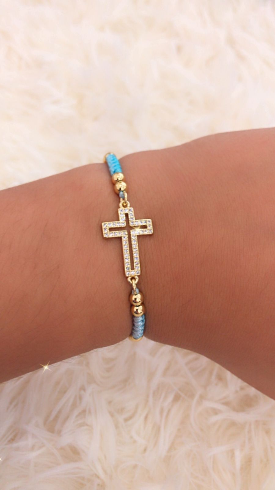 Pulsera con cordón azul y dije de cruz con circonias. ajustable